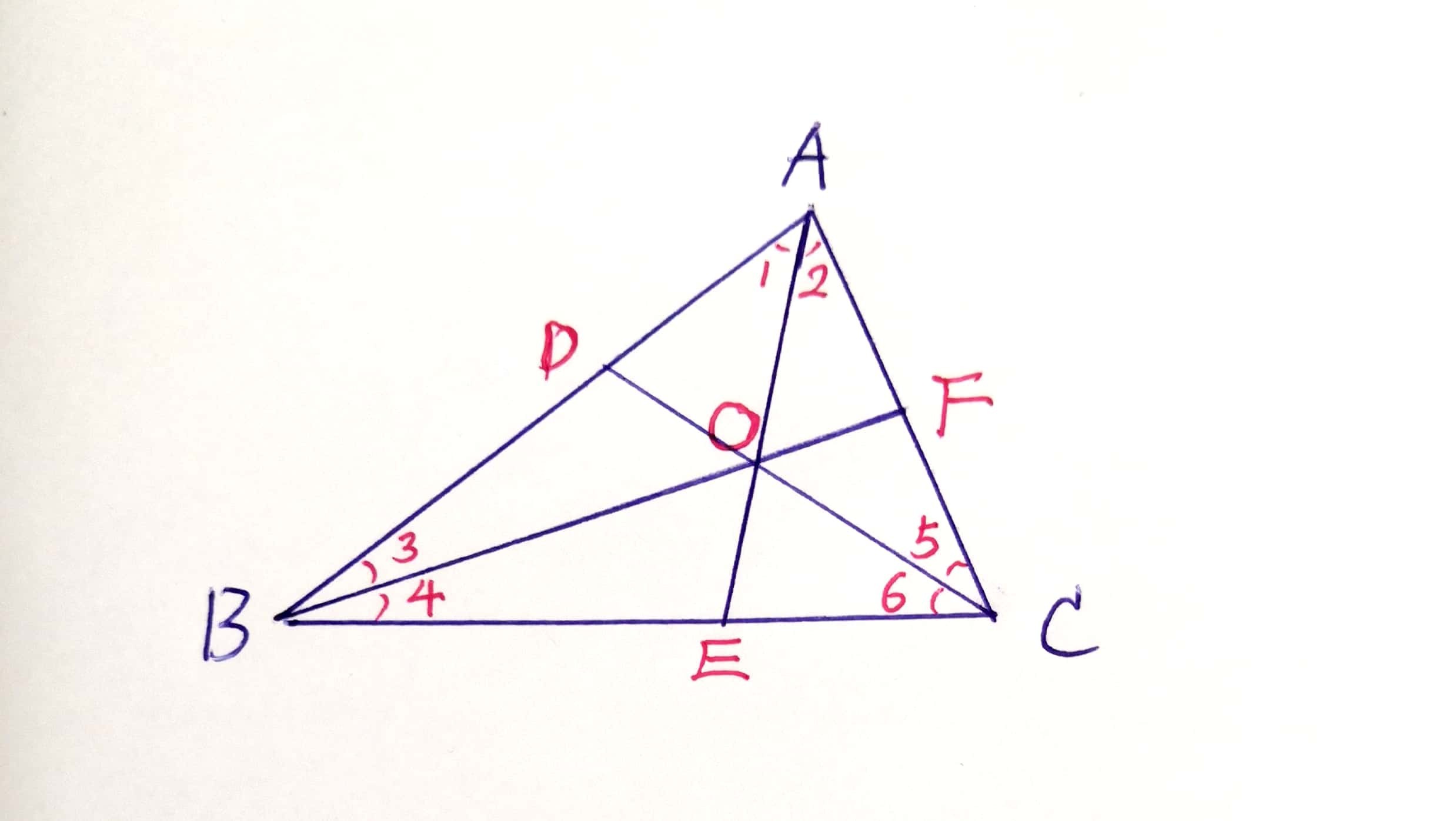 即AE、BF、CD分别平分角BAC、角ABC、角BCA,且AE、BF与CD相交于点O,点O即为△ABC的内心。