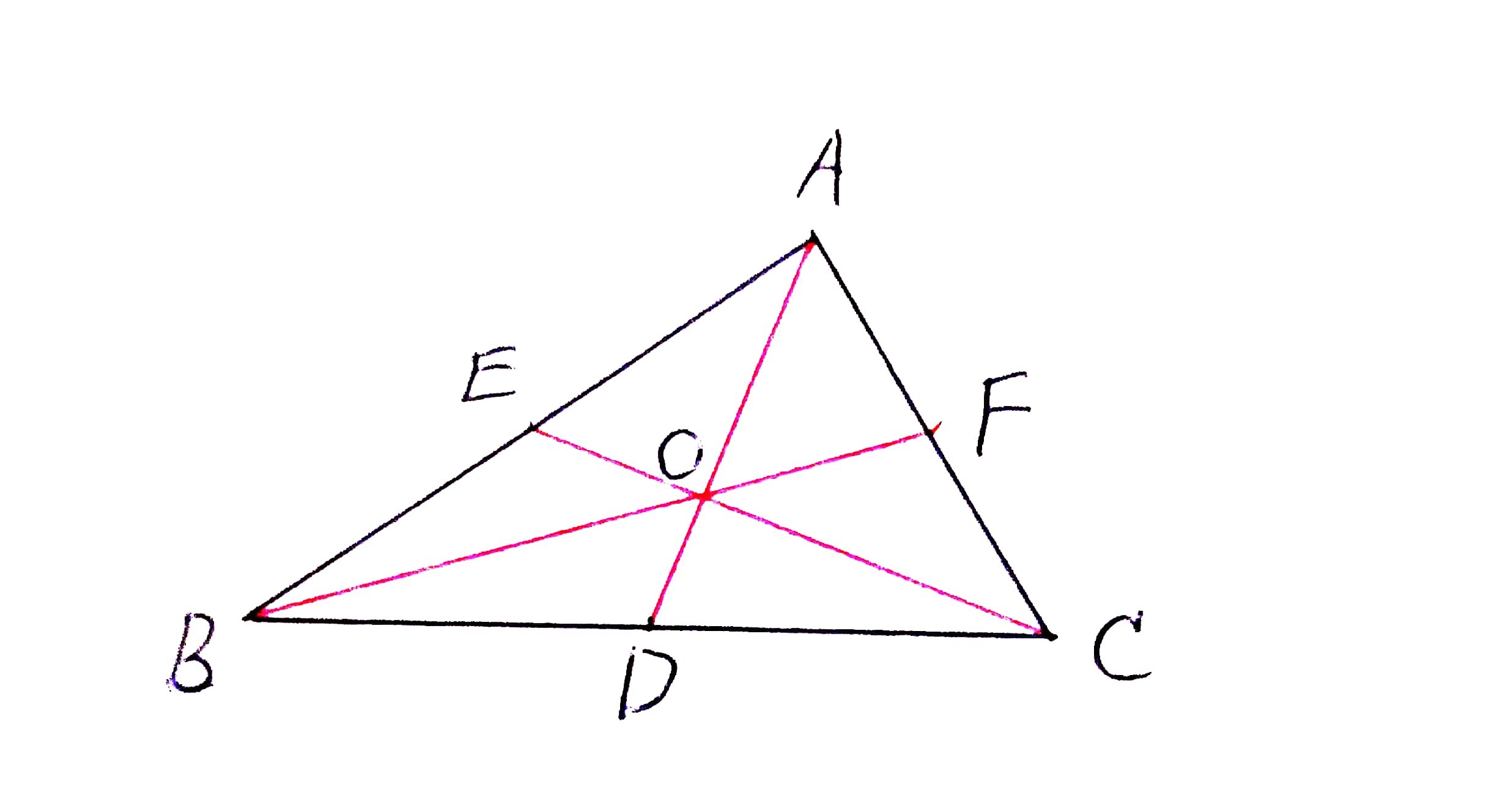[性质1] 三角形的重心到边的中心与到这条边所对的顶点的距离之比为1:2,即OD:OA = 1:2 ;
