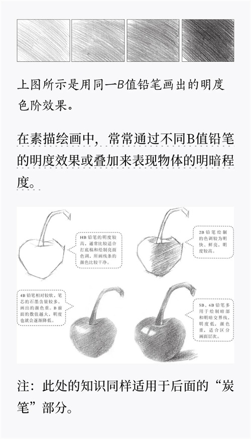 在素描绘画中,常常通过不同B值铅笔的明度效果或叠加来表现物体的明暗程度。