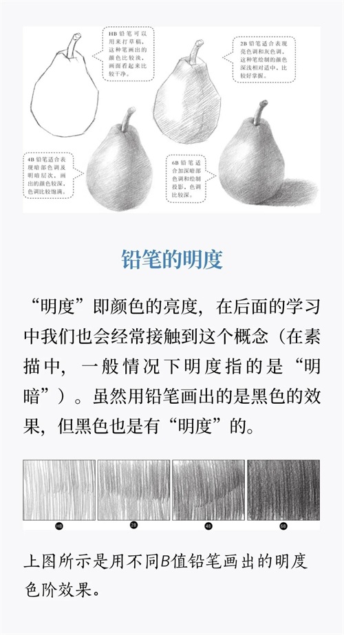 “明度”即颜色的亮度,在后面的学习中我们也会经常接触到这个概念(在素描中,一般情况下明度指的是“明暗”)。虽然用铅笔画出的是黑色的效果,但黑色也是有“明度”的。