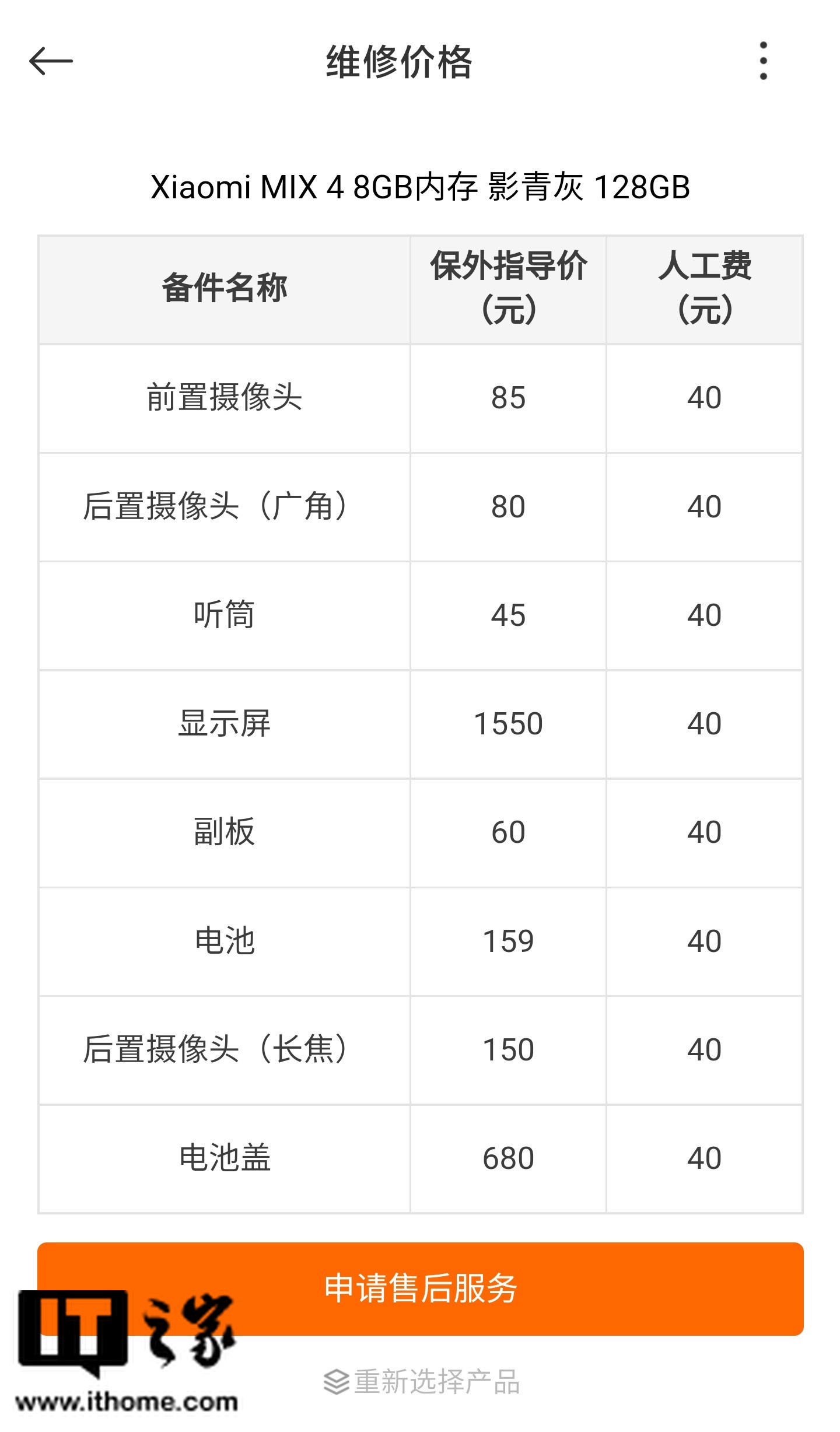 据表格显示,以小米MIX 4(8GB内存 + 128GB存储)影青灰为例,保外指导价包括前置摄像头85元,后置摄像头广角80元,听筒45元,显示屏1550元,副板60元,电池159元,后置摄像头长焦150元,电池盖(陶瓷后盖)680元,每一项的人工费均为40元。