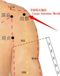 肩髃:属手阳明大肠经。髃,指肩前,手臂外展时,肩上会出现两个凹陷,肩前凹陷为肩髃穴,肩后凹陷为肩髎穴。此穴有疏风通络,舒筋利节之功,能搜上肢风邪,常用于肩臂疼痛(肩周炎,肩臂不举等)之病,特别擅长于肩周围疾病的治疗,常配曲池,合谷等穴同用。