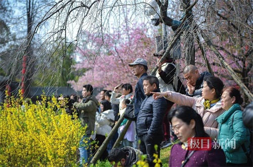 记者现场见到,东湖樱花园内游人如织,热闹非凡。随着气温的回暖,园内的早樱已进入盛放期。寒绯樱、初美人、飞寒樱等各色樱花竞相绽放,它们或含苞待放,或娇艳欲滴,以不同的姿态点缀在枝头,形成了一片绚烂的花海。