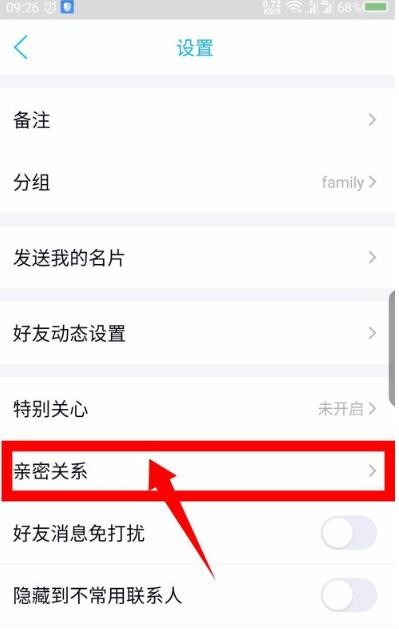 这次打开的设置里面,就能看到亲密关系设置选项了,点击打开。如图所示