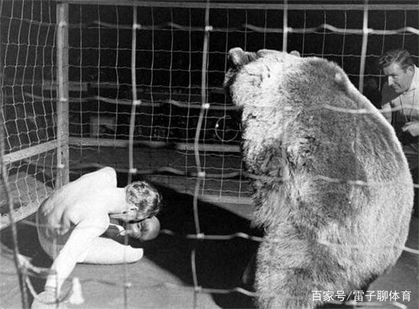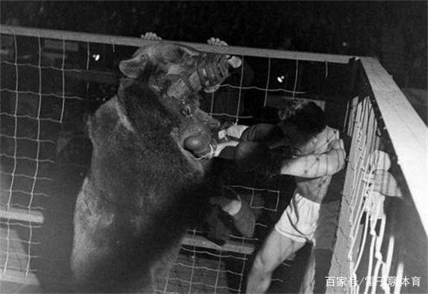 早年很流行让拳击手和袋鼠打架,因为袋鼠的强度,无法承受拳击手的拳头。 后来,有一些奇葩观众想出了将拳击手与强壮的熊进行比较的想法。 这场比赛熊的嘴巴被紧紧的绑着,熊的两只前掌还装了一个拳套,在这场熊与拳王相对安全的进行比赛,结果出乎所有人的意料,在擂台上这只笨熊直接将拳王瞬间秒杀KO倒地!