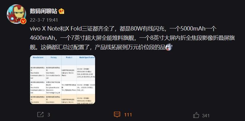 此外,一款型号为 V2170A 的 vivo 5G 数字移动电话机在 3 月 2 日通过了 3C 认证,配备型号为 V8060L0A1-CN 的充电器,也支持最高 80W 输出。数码博主 @数码闲聊站 爆料,这是一款 vivo 的 7 英寸大屏旗舰手机,名为 vivo X Note,其工程机拥有蔡司“小蓝标”,支持红外、防水。