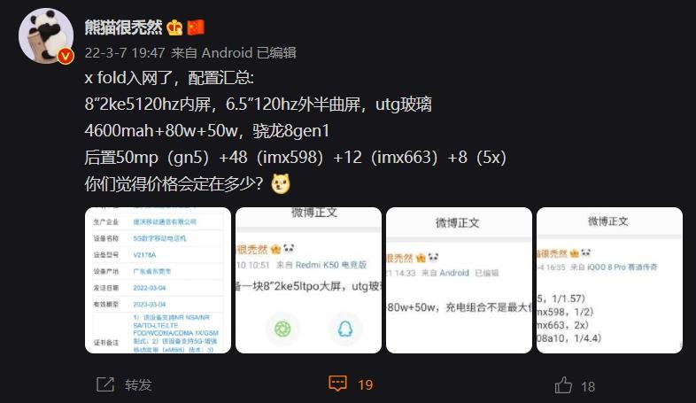 另据数码博主 @熊猫很禿然 爆料的配置,vivo X Fold 搭载 8 英寸 2K E5 120Hz 内屏,以及 6.5 英寸 120Hz 外部曲面屏,采用 UTG 玻璃。