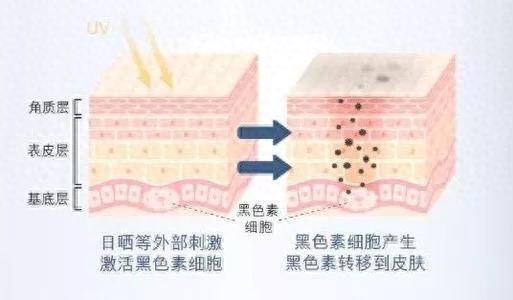 太阳强大的时候,这时候紫外线也很强。它能激活黑素母细胞中的酪氨酸酶与血液中的酪氨酸酶产生一系列反应,生成一种叫“多巴”的物质,进而转化成黑色素,也就是黑斑