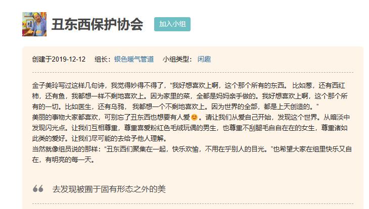 在豆瓣有一个很有趣的小组叫做“丑东西保护协会”,大家在这里分享一些虽然丑但是很有趣好玩的东西,在小组介绍中有这么一句话:“去发现被囿于固有形态之外的美”。这句话实在太美妙了,因为它告诉我们,不要只把眼光放在形态上的美,也去探寻那些形态之下的内在美。