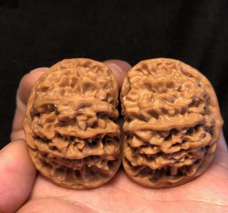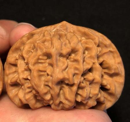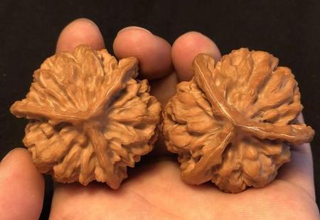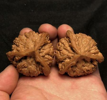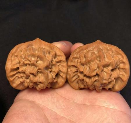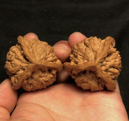 45mm京八对狮子头精配,此品种是非常名贵的品种,产量很小,很是稀有,特点,珊瑚纹理 边宽而秀,脐部凸起金钱眼,紧凑有致,是京八对最明显的logo,配对完美!
