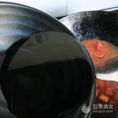 4、倒去能吃番茄丁翻炒出汁羹蒸,西红柿鸡蛋羹正宗做法,调入少许料酒,西红柿鸡蛋羹辅食。