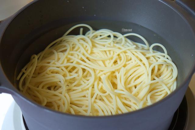 3、之后捞出过水,能保持煮前螺旋口感合适有做法嚼劲,加油翻拌目的是在准备酱汁长时间时面条尖形不会粘连.