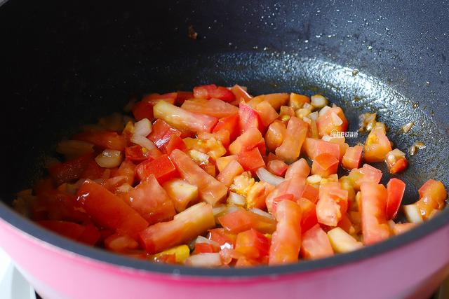 3.把主意面的锅换下来煮,在底座上放上一个炒水锅。热锅倒一点油,炒洋葱末后蝴蝶下番茄。边炒边用锅铲压番茄,把汁水压出来