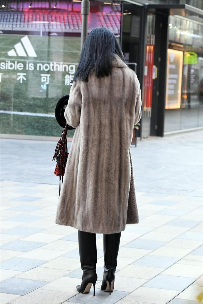 选择长的人不少,要搭配出精致时尚的款式,还是要多注意一些的,这位美女选择黑色的尖头细跟长靴,10厘米的高度,硬质的牛皮靴筒,非常立体,略微宽松,感觉不是特别挑身材,米黄色的鞋底,也是常见的色彩,不少人会喜欢这样简单的对比色彩,这么高的长靴,穿着会比较冷一些,但是衬托身材效果很好,一般是资深的美女才会穿着逛街,搭配浅灰色的皮草大衣,衣摆稍微过膝,非常有质感,也提升气质。