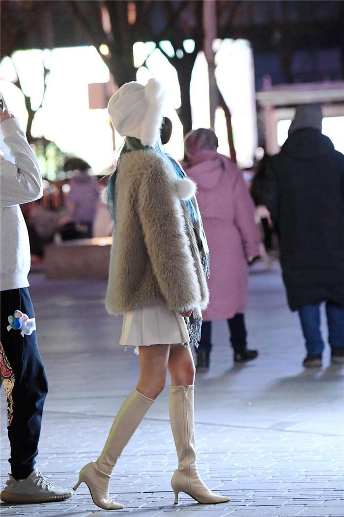喜欢简约风格的人也有不少,冬季里,也有不怕冷的姑娘,她们也在感受冬季的温度,这位美女选择白色的尖头高跟长靴,不是过膝的款式,5厘米的细跟设计,不是很高,大多数美女都可以轻松驾驭,修身的靴筒,是比较挑身材的,要身材苗条的美女才可以搭配这款长靴,白色的百褶短裙,露出一截大腿,非常舒服的搭配,也穿出简约的风格,浅灰色的皮草点缀,短款的设计,这样会有保暖的感觉,搭配白色的棉帽,还有皮草装饰。