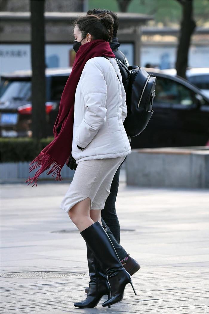 其实生活中精致的靴子搭配,也有不少可以借鉴学习的,这位美女穿着黑色真皮长靴,10厘米的细跟设计,非常好的衬托身材高挑,尖头款式,也有着简约的风格,不少美女喜欢这样的 款式设计,靴筒不是过膝的,到膝盖下面一点,搭配浅灰色的紧身连衣裙,衣摆到西高上面一些,这样把膝盖露出来,也看出美女是真的不怕冷,搭配白色的短款羽绒服,非常舒服的搭配,衣摆稍微长一些,红色的围巾,非常保暖,也有了冬季的感觉
