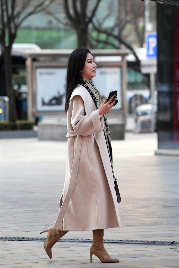 到了冬季,出门的人少了很多,随着疫情的恢复,时尚街区,行人也比前段时间多了不少,大多数人还是注意身体健康的,当然出门要让自己精致一些,还要搭配出保暖,长靴搭配,也多了起来,不少姑娘还是喜欢高跟款式,这位美女选择浅棕色的高跟长靴,6厘米的高度,不是超细的鞋跟,衬托身材效果不错,搭配米色呢子大衣,衣摆很长,扣子和腰带都没有系上,搭配一条灰色的字母围巾,非常舒服的搭配。