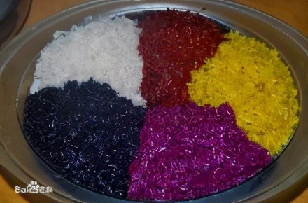 达,稻米也自然成为壮族人民的主食。稻米制作方法多种多样,有蒸、煮、炒、焖、炸等,各种米饭、米粥、米粉、米糕、糍粑、粽子、汤圆等,是壮族人民日常喜爱的食品。如果掺和其他材料,还可以制成许多更加味美营养的食品,如八宝饭、八宝粥、竹筒饭、南瓜饭、“彩色糯米饭”等。