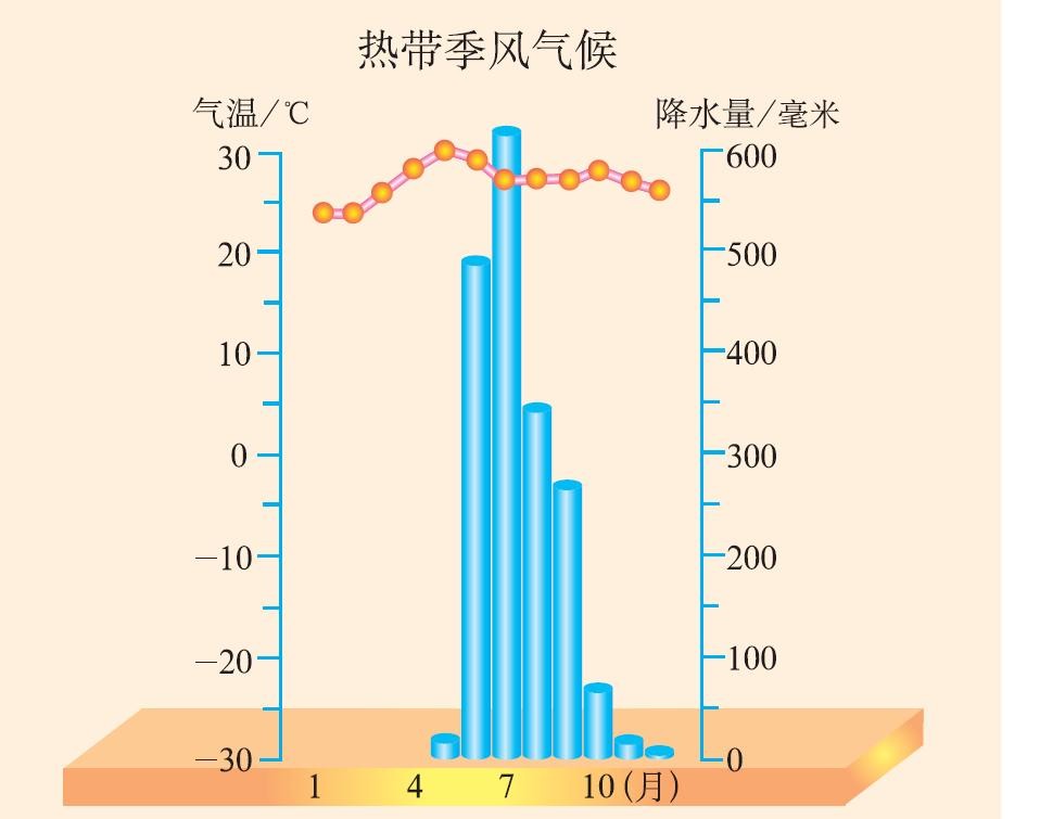 ● 气候特征:全年高温,有雨季和旱季之分。旱季盛行东北风,雨季盛行西南风(每年6—9月,盛行西南季风,降水多,为雨季。每年10月——次年5月,盛行东北季风,干旱少雨,为旱季)。