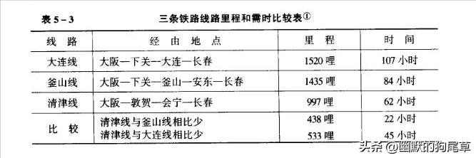 如果修成吉会路情形就会发生很大变化,从军事角度讲日本军队进人中国东北腹地,已有由釜山经安沈进人的一线;由大连经南满铁路进入的一线。但这两条线路与吉会路相比其军事价值却相差悬殊,以日本大阪和长春作为起点、终点比较详见表5-3。从表5-3中可看出,一旦吉会路修成,由日本大阪经朝鲜清津港和吉会路到达长春,可比经大连港的南满线近533哩,省45个小时;比经釜山港、安奉线近438,省22个小时。