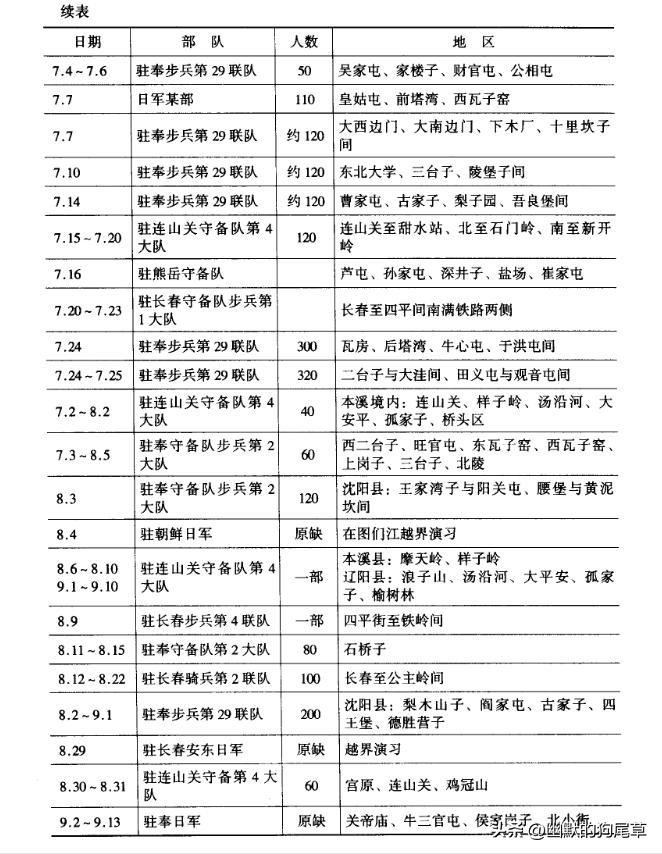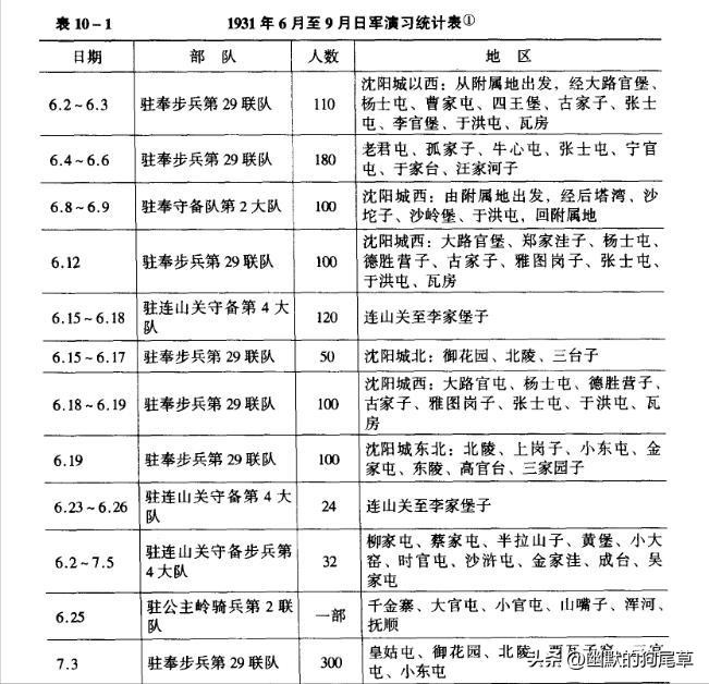 日军在关东州和铁路附属地的演习及日军在沈阳铁路附属地内的市街战演习等未包括进去。演习的种类繁多,有行军演习、实弹演习、攻城演习、联络及传令演习、架桥及施放水雷演习、夜战演习等。这些演习都是越出铁路附属地界限的越界演习。不少演习的区域属中国军事要地的附近地区,例如,日军6月19日、7月3日、7月10日的演习都接近东北军第七旅的驻地北大营。事变前日军的频繁演习,显然是日本关东军发动事变的预演,演习甚至直接对着发动事变预定攻击的目标--北大营。