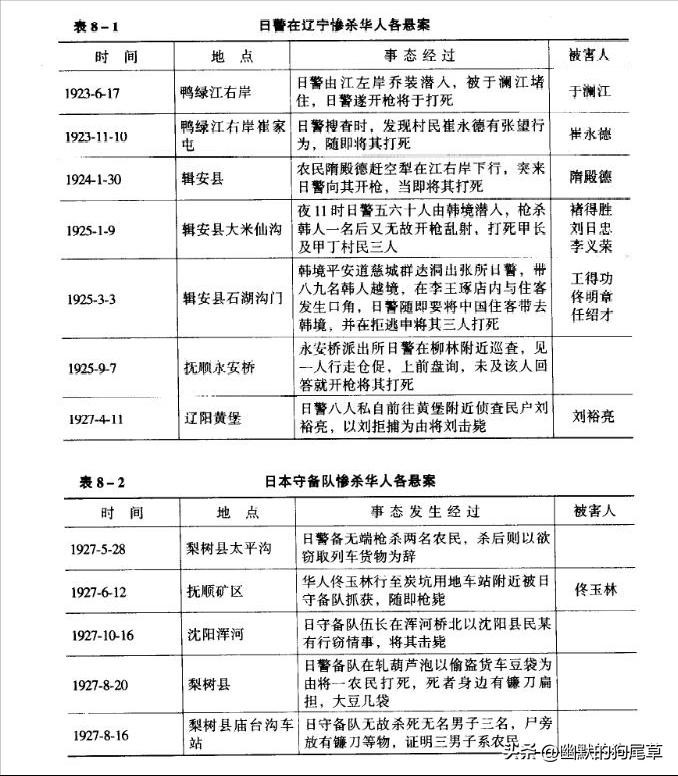 日本军队和警察驻扎东北期间,依据军事强力,大肆乱杀无辜,制造血案,表8-1和表8-2仅是日本军警制造血案的一部分。日本军警这种藐视我主权的行为,既严重地破坏了东北的社会秩序和社会稳定,也严重地损害了中国国家主权。日本军警在东北滥杀无辜的暴行,实际上就是近代以来列强对弱国所实行“编辑"搜图续。日本企图通过这种强权行为,征服东北,征服中国,扩大日本在中国东北的势力。