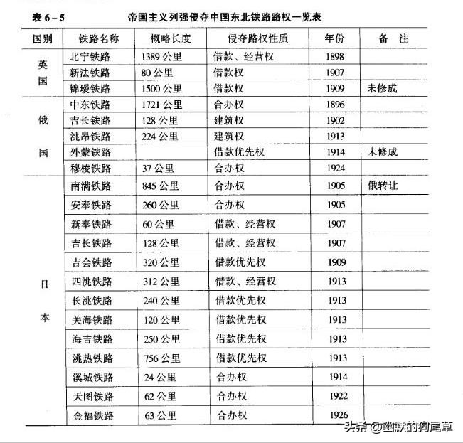 直到“九一八”事变前,日本的“满蒙五路”计划仍一无所获。到“九一八”事变前,帝国主义各国在东北侵夺中国路权的情况如表6-5 所示。