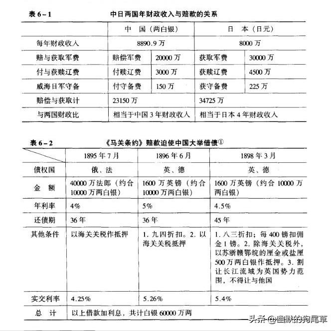 衰败的清政府不敢也无力再战,只能按日本的要求于1895年4月17日在《马关条约》上签字。《马关条约》是1840年以来一系列中外不平等条约中最苛刻的一个,《马关条约》使日本“一约暴富”,使中国负债累累,国际地位一落千丈,并引发了帝国主义瓜分中国的狂潮。从表6-1、表6-2中可看出《马关条约》赔款及对中日两国带来的严重影响。
