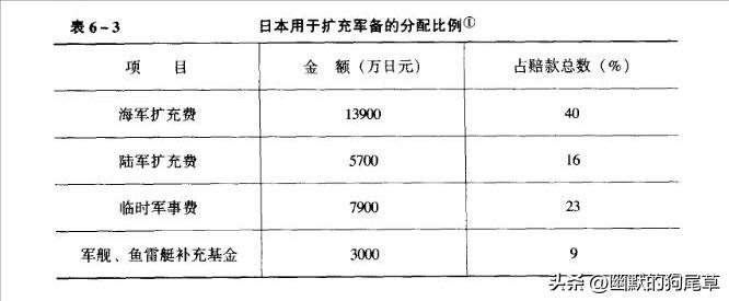 日本则通过甲午一战获胜改变了他们的国际形象和地位,由一个并不起眼的小国,因为战胜了中国而让西方列强刮目相看。《马关条约》赔款还使日本一战而成了暴发户。外务大臣井上馨兴奋地说:“一想到现在有35000万日元滚滚而来,无论政府或私人都顿觉无比富裕。”日本政府将中国赔款的88%用于扩充军备,详见表6-3。