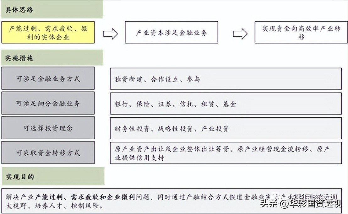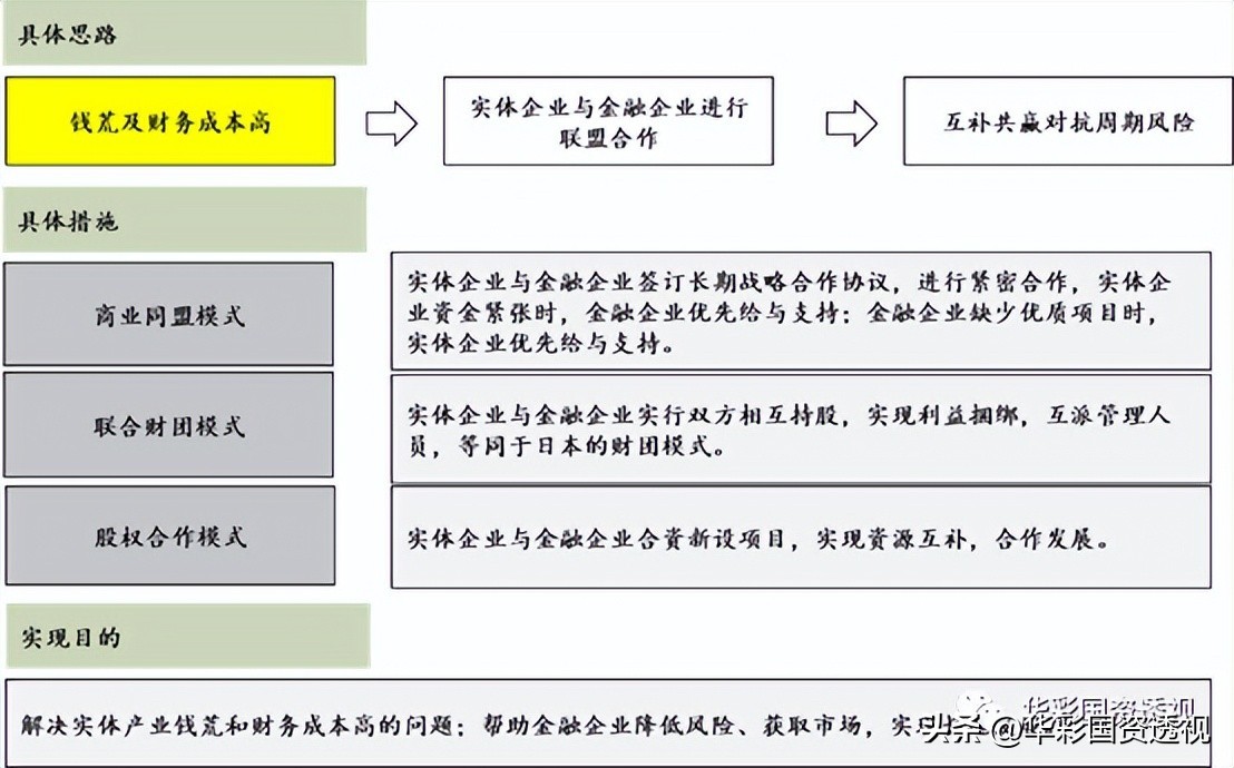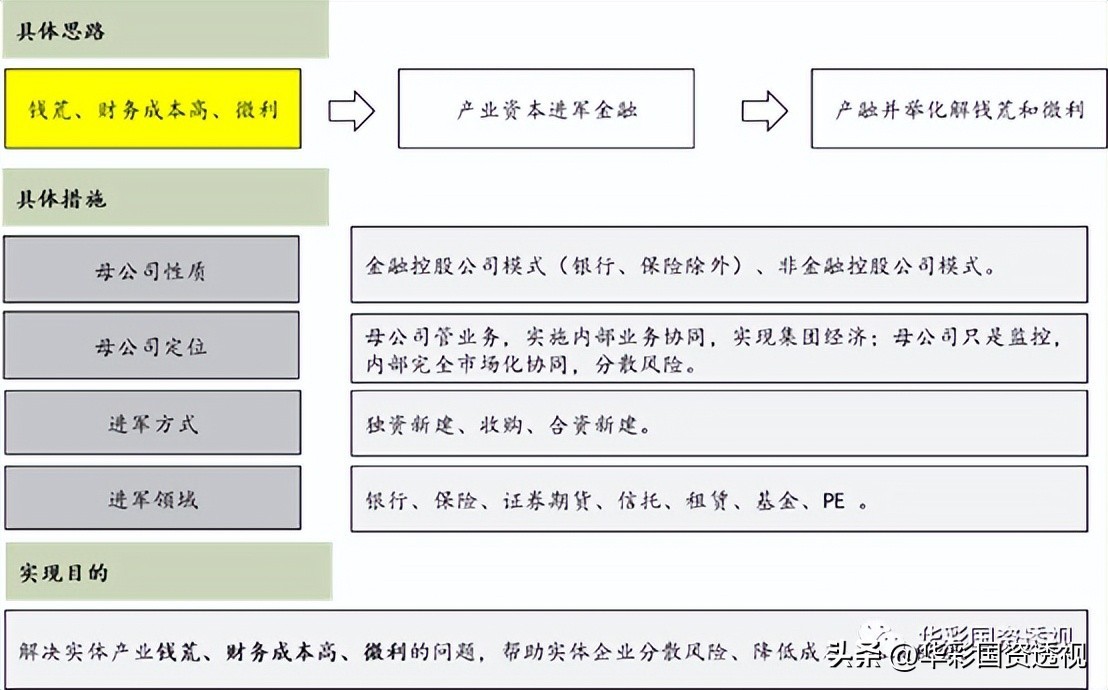 我们知道不可能实业企业都拥有很多金融牌照,拥有金融能力来自我服务,很多企业的常态往往是自己有一小部分金融服务,外面借一大部分金融服务。实业企业产融结合过程切不可草率追求全牌照。