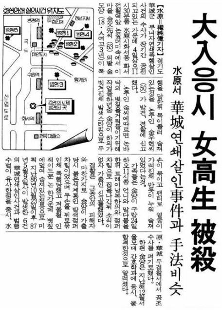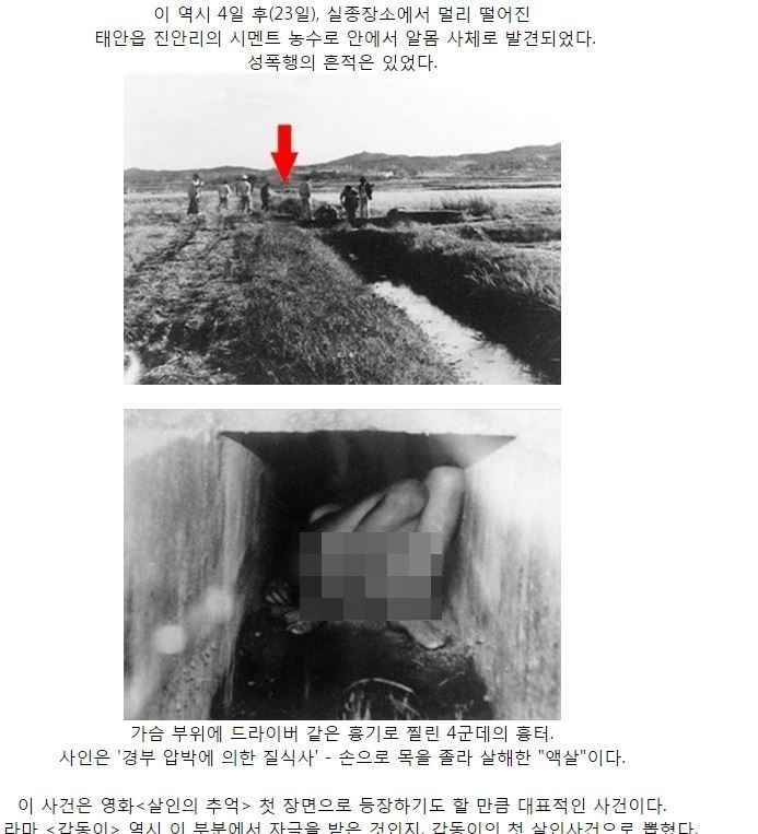 1987年1月10日,18岁的华城女学生下了晚自习回家途中失踪,隔日双手反绑、嘴巴被袜子塞住,死在了田埂上。5月5日,30岁的主妇,晚上拿着伞出门接丈夫回家的路上,被自己的胸罩勒死。