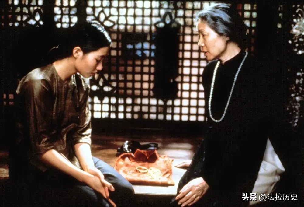 夫人对梅的照顾:这个镜头用来展示梅与夫人之间的特殊关系。少奶奶对梅格外关爱,因为梅和她已故的女儿年龄相仿。这一镜头中,可以看到夫人温柔地为梅梳理头发,给她穿上漂亮的衣物,表达了她对梅的深情厚意。