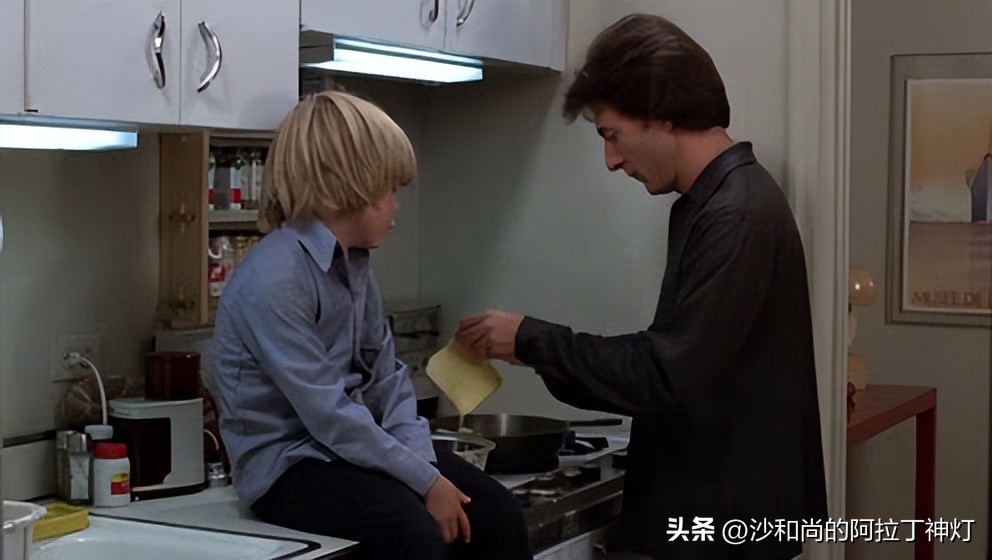 此外,影片在空间应用与剪辑方面也十分巧妙。故事发生的空间主要集中在家中、泰德的工作场景、法庭以及少部分的室外场景,但导演充分使用同一空间表现不同戏剧点,以此来安排镜头和剪辑。如在乔安娜走后的第二天早晨父子俩共做早餐的戏份,影片将泰德和儿子比利的反应进行密集剪辑,中间插入一些失控的烹饪内容局部特写,而到了影片结尾处,泰德和比利在分别前一起做最后一顿早餐时,同样的空间和主机位,但这次却以长镜头为主,仅在最后父子二人对视时切进了两人的面部特写。这种剪辑方式不仅展现了父子关系的变化,也让观众更加深刻地感受到了影片的情感张力。