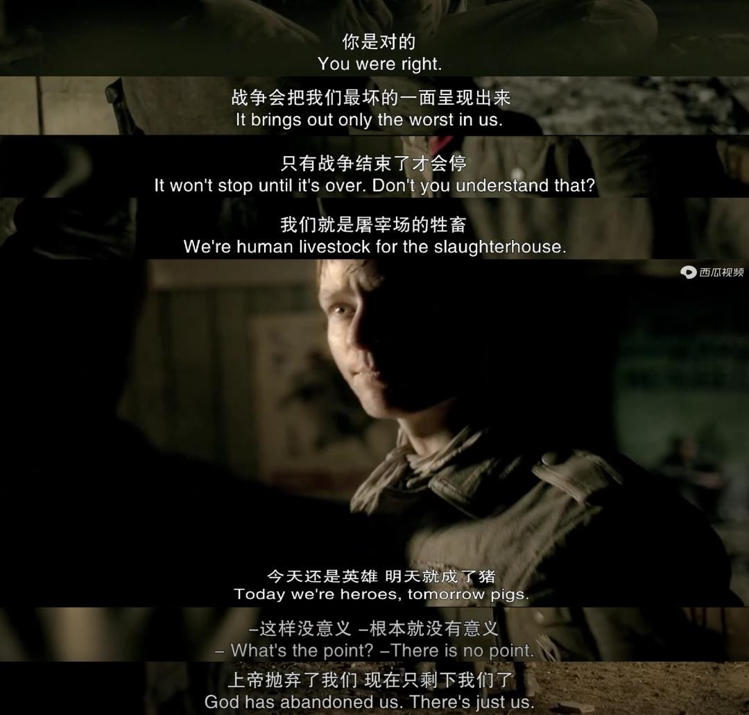 这是非常可惜的事,因为这部影片虽然没有绚丽的画面,但就剧中人物的精彩表演就值得一看,就电影本身,还体现出对于战争的反思,摒弃了以往站在战胜国视角所体现出来的战争的正义、邪恶等。