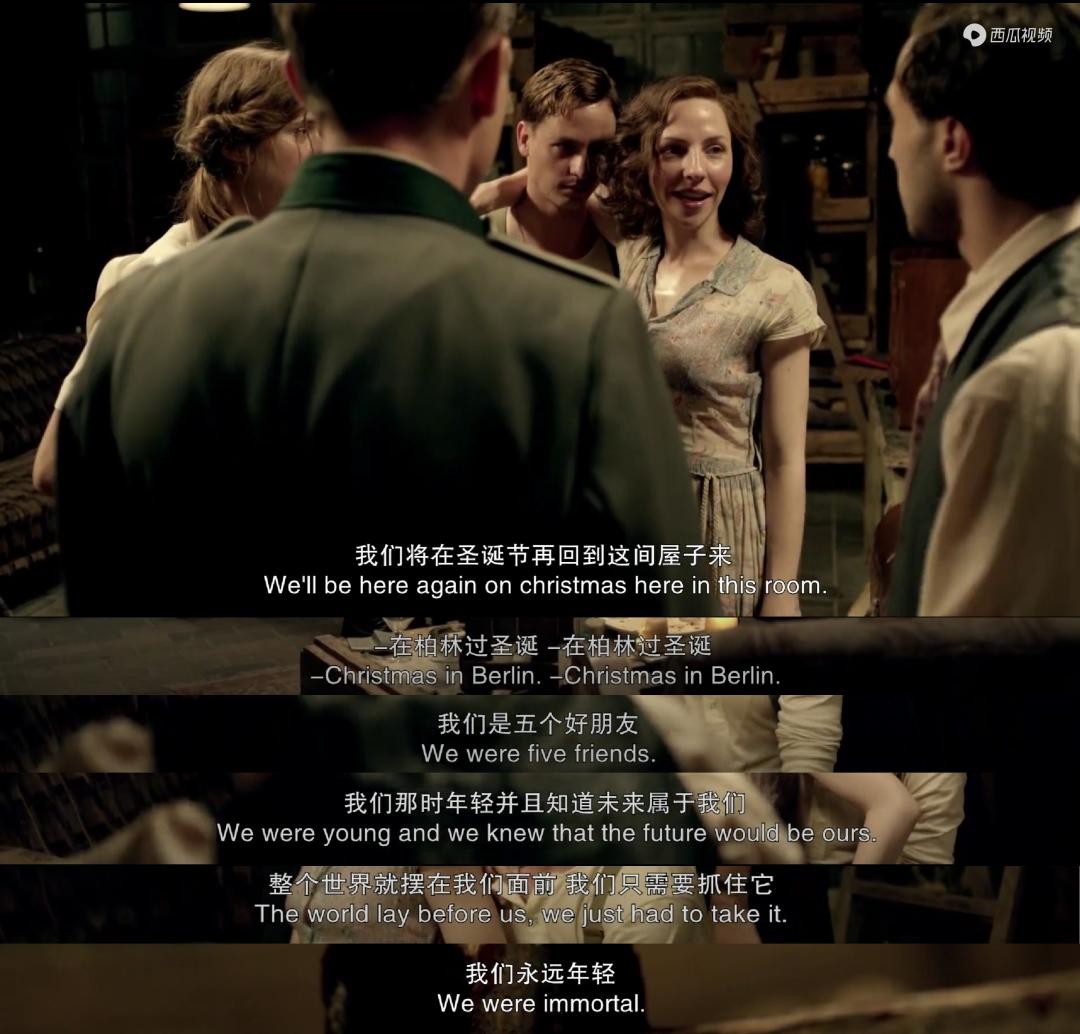 |引用【片子的5个主人公很典型,哥哥威尔汉姆是武装力量中坚,国防军,经验丰富,热爱国家和职业,相信政府和元首,虽然对决策不满,但该执行就执行。弟弟弗雷德汉姆则是大学生代表,笃信哲学和逻辑,在片子一开头就说“战争会把我们最坏的一面压迫出来”,为整个片子定了调。美女格雷塔有心计,虚荣,轻浮但相信爱情。护士恰莉天真善良单纯,为了护士的本职而主动投入战争。维克多最惨,德国的犹太人,这个身份不妨碍和格雷塔相爱,与大家举杯共享友情。这就是德国社会当时的缩影,抛开被蛊惑被疯狂的那些狂热者,大部分德国人就是出于各种原因,毫无恶意的卷入了这场战争。】