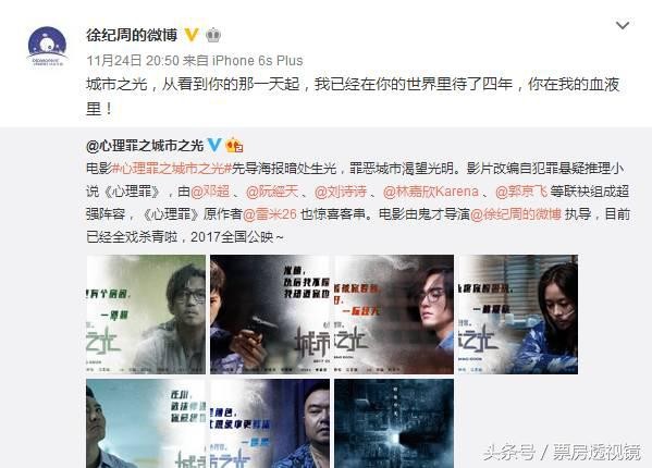 时间回到2012年,那时徐纪周在重庆拍戏,雷米的《心理罪之城市之光》由重庆出版社出版,正式上市之前,徐纪周提前拿到了样书,看了后“夜不能寐”,随后和雷米在微博上加了关注,后来要了电话,电影版权的事情就这样定下来了。