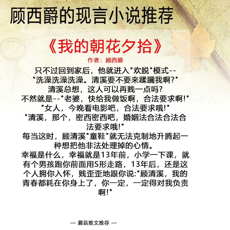 重点:顾西爵笔下的男主都非常的深情,而这本书的男主家席郗辰就是其中的代表了,暗恋了女主12年,在女主出国期间,一直默默的关注着女主,走过女主走过的路,看过的风景,唯一比较不能接受的就是女主的家事了,看的时候很感动,这本小说分为上下两部,第一部不是很甜,不过被男主的深情所感动,第一部是婚后文超级甜。好看。