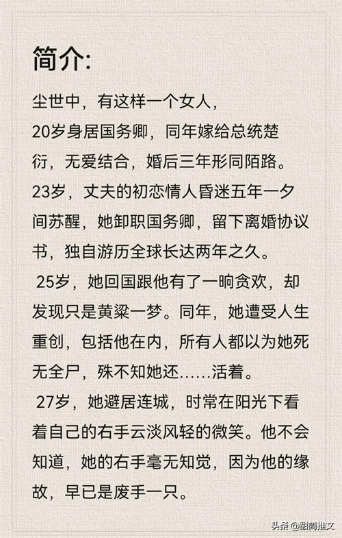 读后感:这本又虐男主又虐女主,典型的追妻火葬场。前面觉得男主太过冷静,而女主太过骄傲了,看到后面才知道男主算计了所有人包括他自己,只为了女主(剧情不适合剧透)男主爱的比较疯狂霸道,在他心中最重要的是女主,孩子都比不上。女主人设也讨喜,敢爱敢恨,聪明独立不圣母。