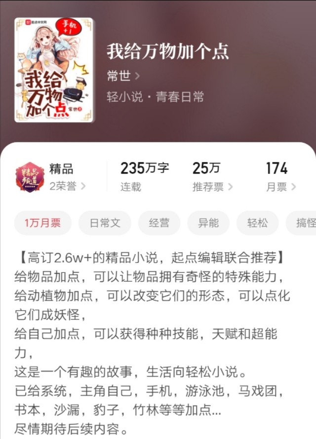 故事梗概加简评:小说讲诉了一个从偏远的小村庄考到魔都上大学的穷苦孩子,为了不给家里增加压力,他努力勤工俭学,原本一切都向着好的方向发展着,突然有一天,他得到了一个系统,一个可以给万物加点的系统,他的生活发生了彻底的改变。