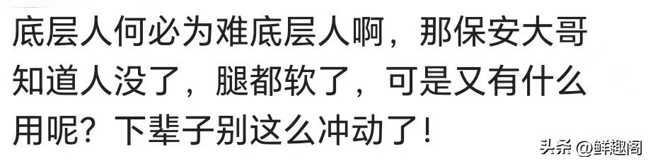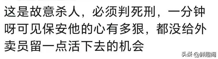 据说这位保安得知外卖员人已经不在了,腿吓得都软了,这时候他的情绪恢复了,似乎也极度的懊悔,可是已经晚了,因为他明白自己将要面临什么样的结局。话说回来,保安的做法固然很过激,假设小区的规定相对松一些,是不是就会避免悲剧的发生。