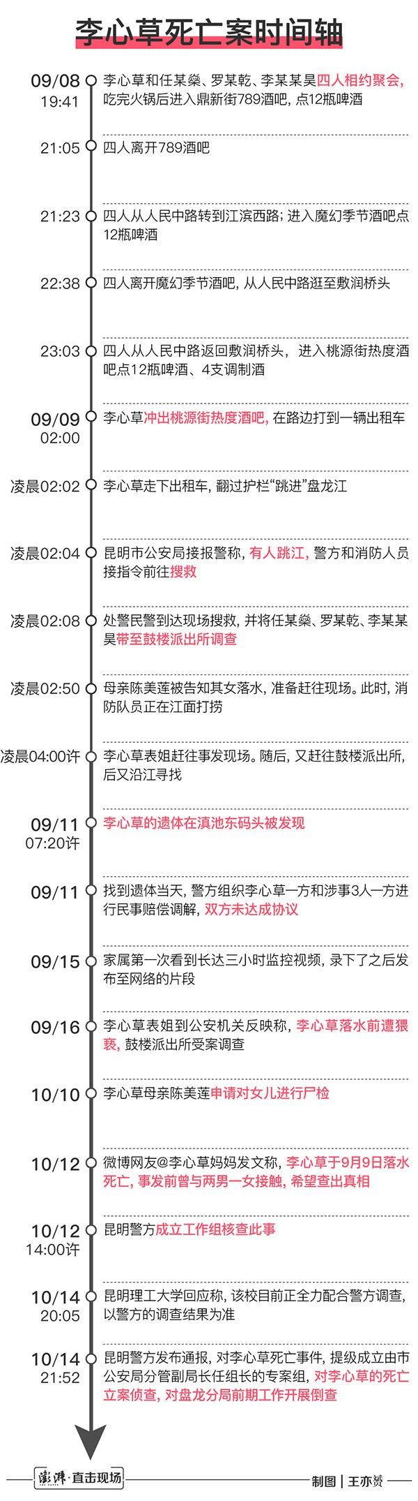 从李心草赴约当晚溺亡,到其母在网上发帖质疑,再到警方立案侦查,这35天里发生了什么?澎湃新闻根据相关视频、当事人介绍及警方公开通报内容,梳理了李心草案案发后的时间线,以还原事件经过。