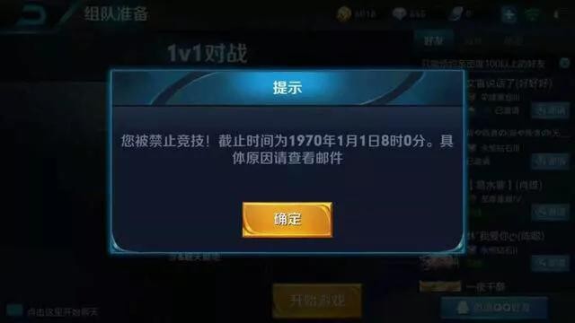 对于禁赛的处罚很多玩家都已经熟悉了,这是一个很常见的处罚,在被扣分或者游戏时间过长之后,都会遭遇这样的处罚,但是禁赛的时间,一般都是几分钟或者几个小时。然而老版本有的玩家就比较衰了,直接被系统给禁赛到了1970年,如果时间不会倒流的话,账号也就不会解封了,这相当于被天美永久禁赛了。