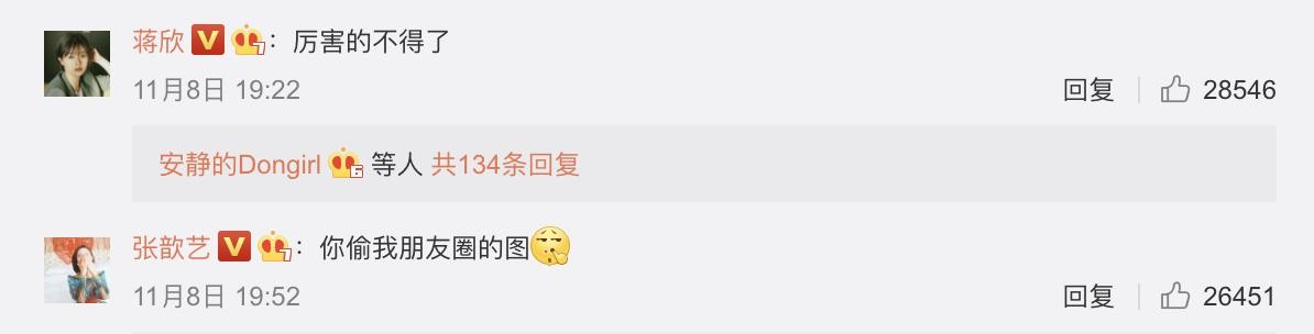 张歆艺在评论区留言抱怨:你偷我朋友圈的图!