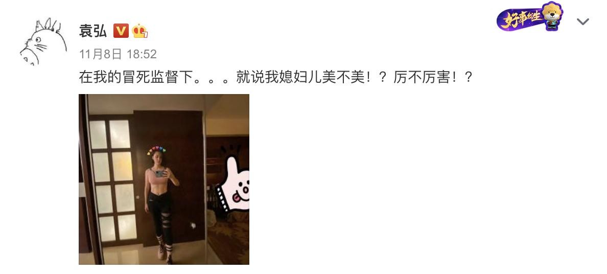 11月8日晚,袁弘在社交平台上分享了妻子的近照,并附文:在我的冒死监督下……就说我媳妇儿美不美!厉不厉害!