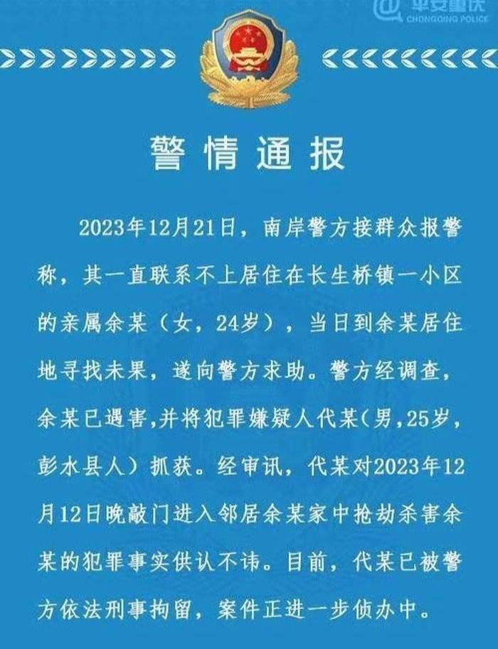 1月4日重庆市公安局南岸分局发布警情通报:2023年12月21日南岸警方接到群众报警称其24岁的女儿余娟在长生桥镇的江南水岸公租房里失联,期间家人多次电话联系未果,随后有亲戚到到余娟居住地寻找仍然未果;经警方走访调查后发现余娟已经遇害,犯罪嫌疑人代某(男,25岁,彭水县人)系余娟的邻居,代某到案后对自己抢劫、杀人的行为供认不讳。