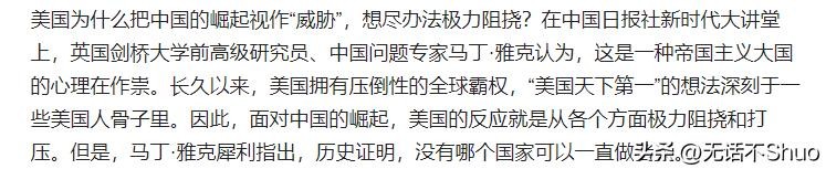 然而美国针对中国的原因大家众说纷纭,英国学者也都看不下去了,指责美国:“这是一种帝国主义国家的心理在作祟”。