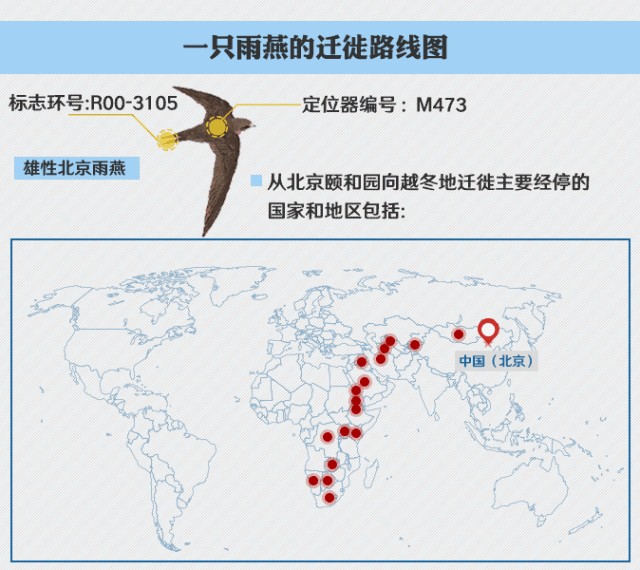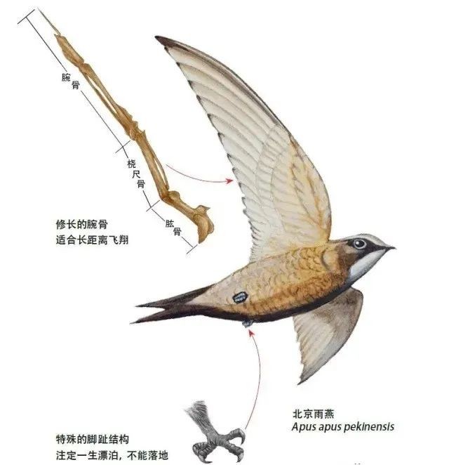 北京雨燕属雨燕目、雨燕科,是一种小型候鸟,寿命可超过20年,它们4月份来北京,夏天在北京繁殖,到了7月中下旬就开始迁徙,跨越近20个国家和地区,最终到达非洲越冬(最远的能够到达南非),全年迁徙距离约为3.8万公里。