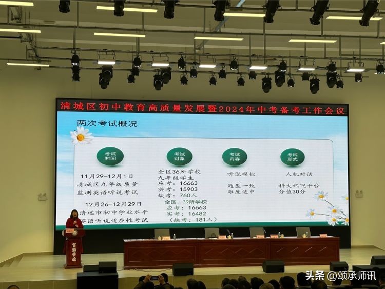 清城区教育局党组书记、局长刘艺东、清城区教师发展中心相关教研员、各中心学校校长及中学业务、全区各初中学校 (含九年一贯制 )书记及校长、分管九年级行政及九年级级长等近200人参加此次会议,共同探讨和规划中考备考策略,确保全区中考备考工作有序、高效进行。会议由清城区教育局党组成员、区教师发展中心主任郑列国主持。