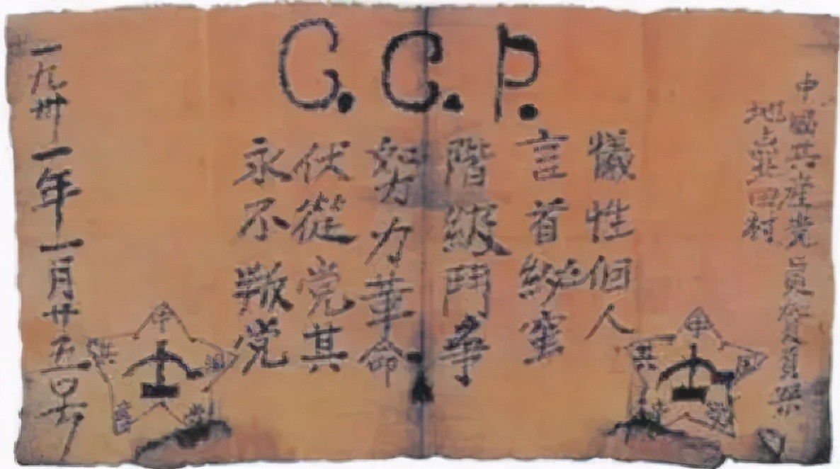 毛泽东写的这份24个字的入党誓词,一直没有发现文字记载,直到1951年7月,时任内务部长的谢觉哉到革命老区江西慰问时,看到了老红军贺页朵上交的珍藏了20年的入党誓词。泛黄的布片最上面写的是“CCP”,下面从右到左写了24个字的入党誓词。因为识字不多,贺页朵还写错了6个字。
