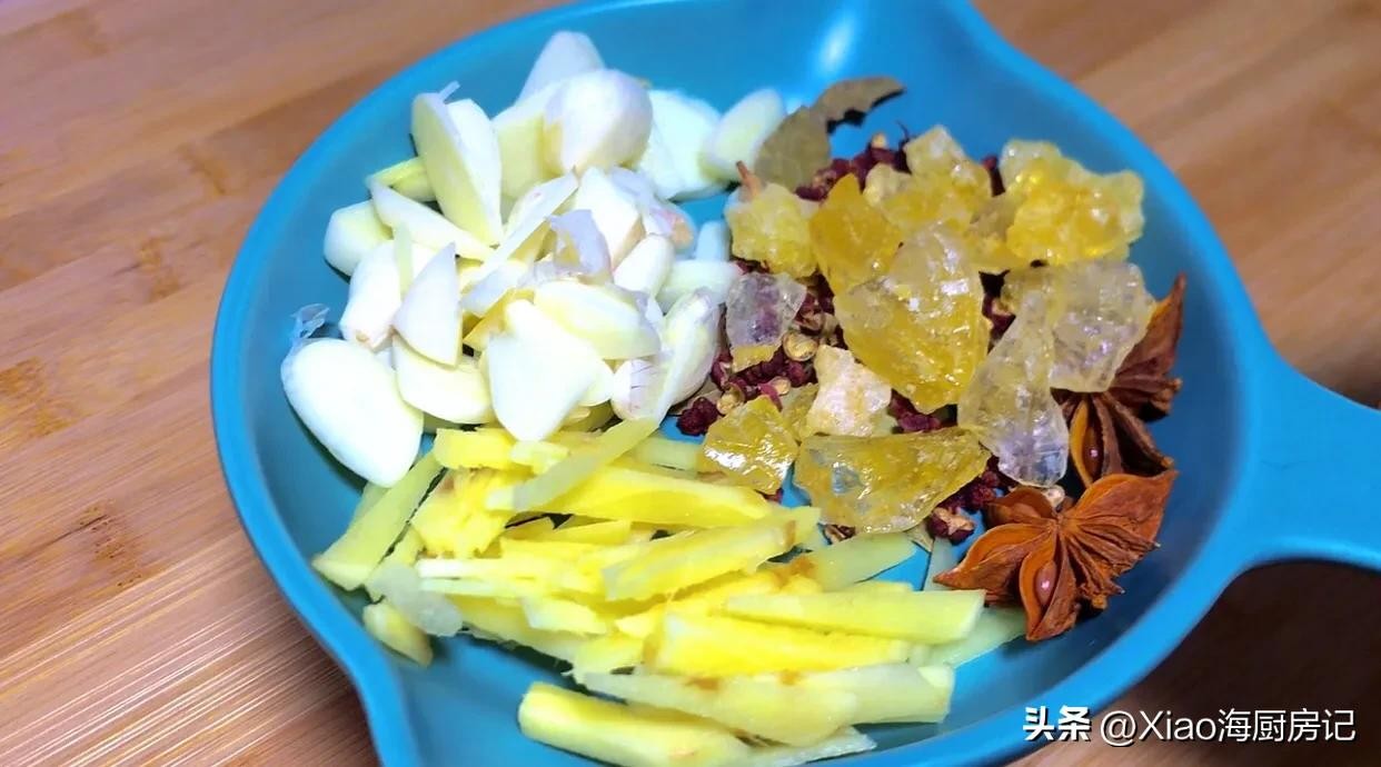 4.这个时候我们再切点姜丝 ,蒜片再放几片香叶 ,八角,少许花椒粒 ,再放入适量冰糖 ,食材全部准备好了